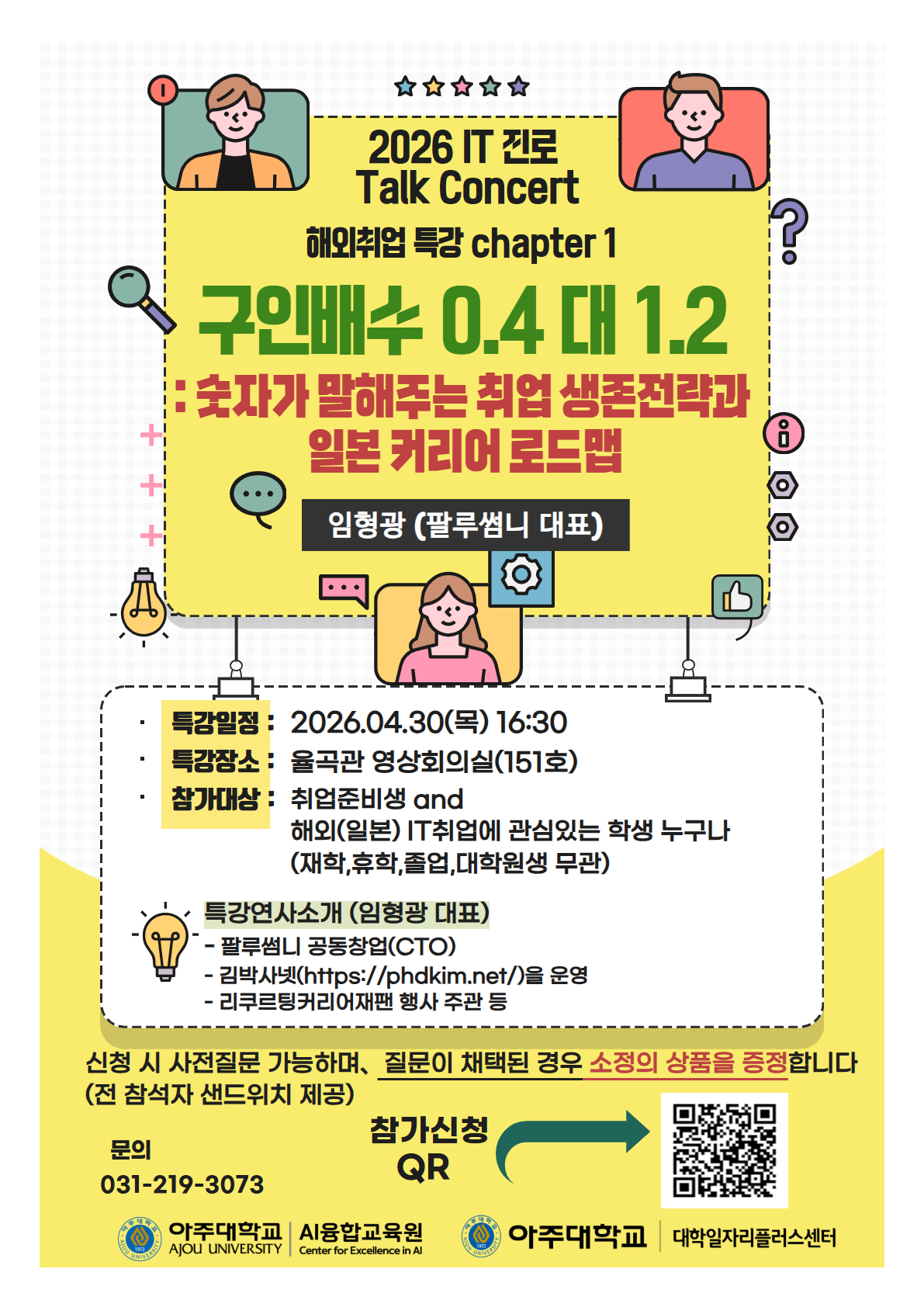 AI융합교육원에서는 2026.04.30(목) 2026 IT 진로 Talk Concert '[구인배수 0.4 대 1.2] 숫자가 말해주는 취업 생존전략과 일본 커리어 로드맵'특강을 개최합니다.