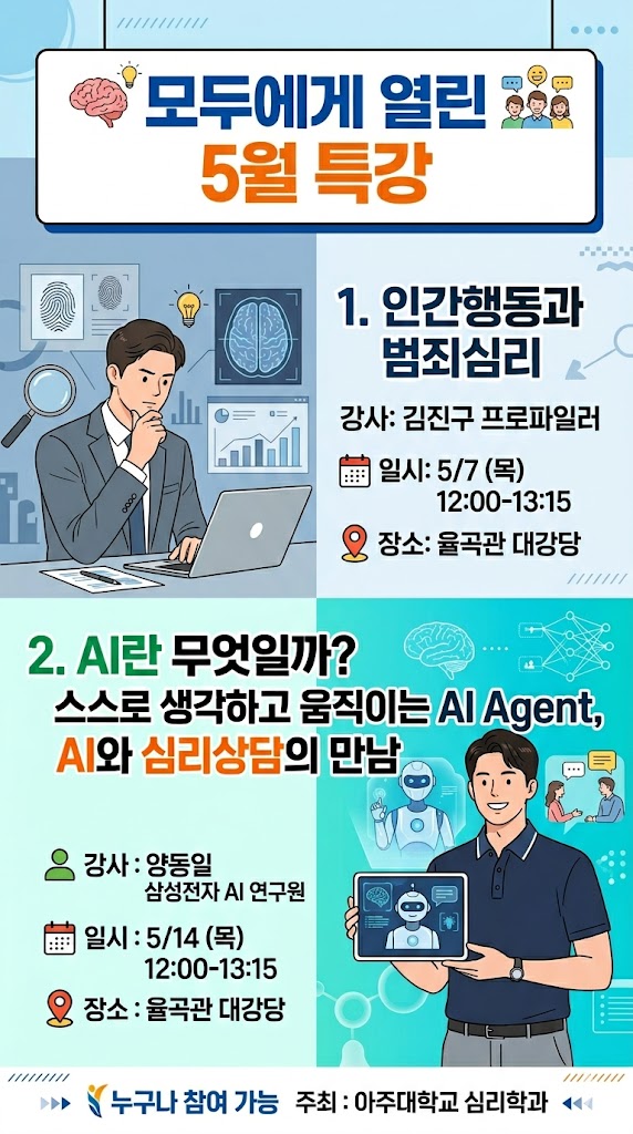 5월 7일(목)과 5월 14일(목)에 심리학과 특강이 진행될 예정입니다.