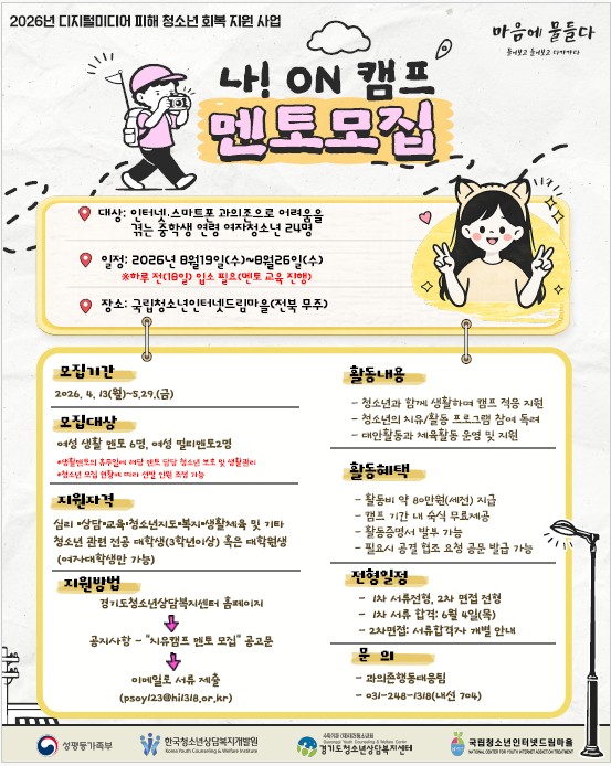 경기도청소년상담복지센터에서 디지털미디어 과의존 청소년을 대상으로 7박 8일 기숙형 치유캠프를 운영하고 있으며, 청소년들과 함께 생활하며 정서적 지지 및 건강한 관계 경험을 제공할 멘토를 모집하고 있습니다. 학생분들의 많은 관심과 참여 부탁드립니다. (대학원생도 가능)