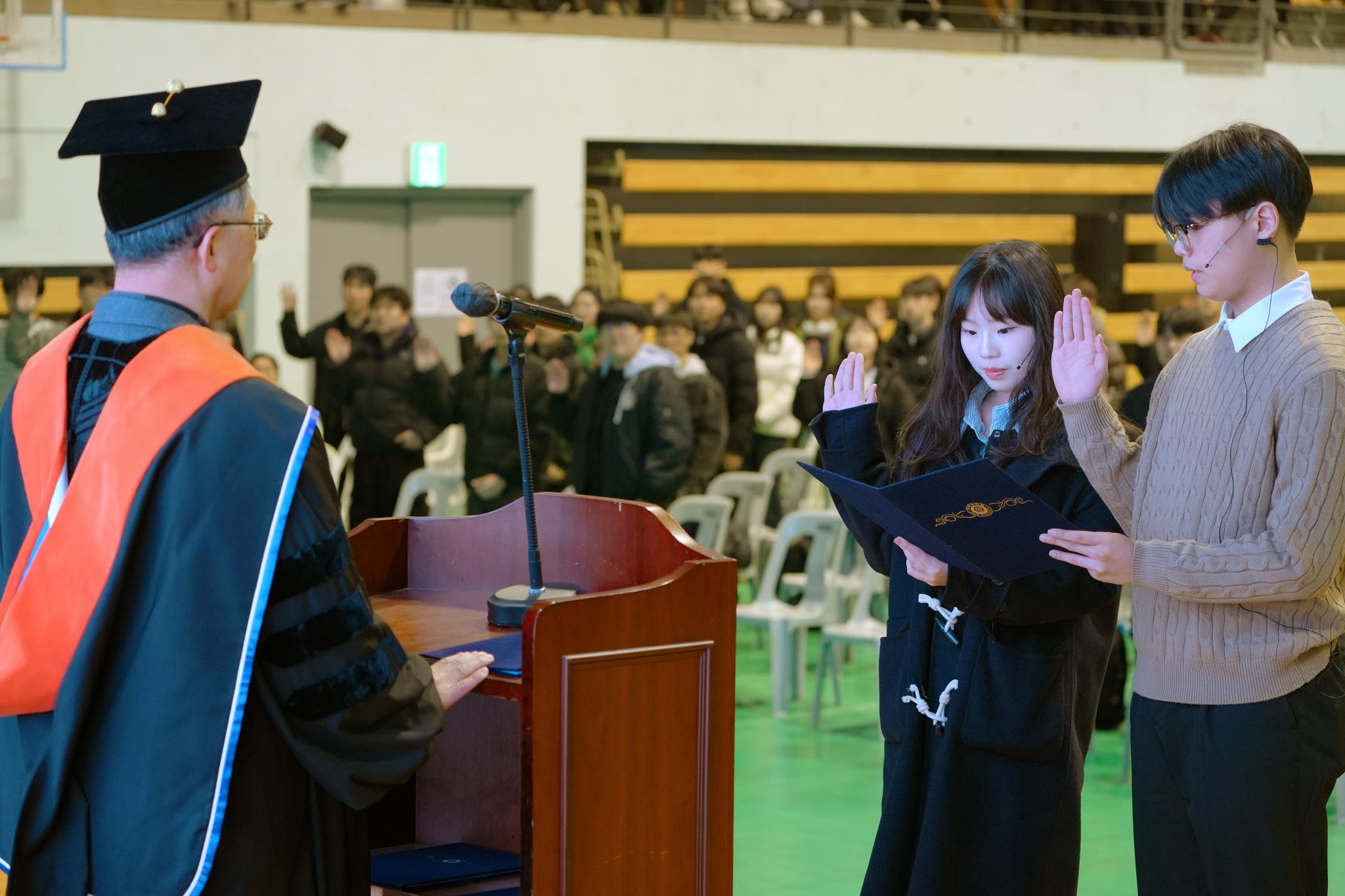 신입생을 대표해 문현진(디지털미디어)·김혜리(약학) 학생이 모든 신입생들과 함께 ▲성실하게 학업에 정진 ▲용기 있게 도전 ▲타인과 약자를 배려 ▲더 나은 사회를 위해 기여하는 아주인이 되겠다고 선서했다.