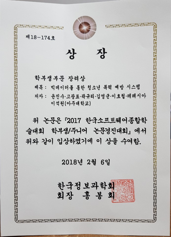 2017년 12월 20일~22일, 부산 벡스코 컨벤션센터에서 열린 2017 한국소프트웨어종합학술대회(KSC2017)에서 아주대학교 소프트웨어학과 재학생 세 팀이 학부생 논문경진대회 부문에서 다음과 같이 우수한 성적으로 수상하였습니다. 축하합니다!!* 우수상 – 김현준, 정진선, 이관호, 이원찬, 이효철, 테레시아, 이석원 “기상에 따른 감기위험도 예측분석” * 장려상 – 옥정우, 김희진, 조대하, 주현수, 이효철, 테레시아, 이석원 “영화 메타데이터 기반 관객수와 손익분기달성 예측” * 장려상 – 윤진수, 고광표, 곽규리, 김영균, 이효철, 테레시아, 이석원 “빅데이터를 통한 청소년 폭력 예방 시스템” 이는 2017학년도 2학기 소프트웨어학과 집중교육1 (지도교수 이석원), Data Science and Knowledge Engineering 수업에서 다양한 프로젝트를 수행한 결과이며, KSC 2017 학회참석 및 발표는 소프트웨어중심대학 사업단 지원을 받았습니다.