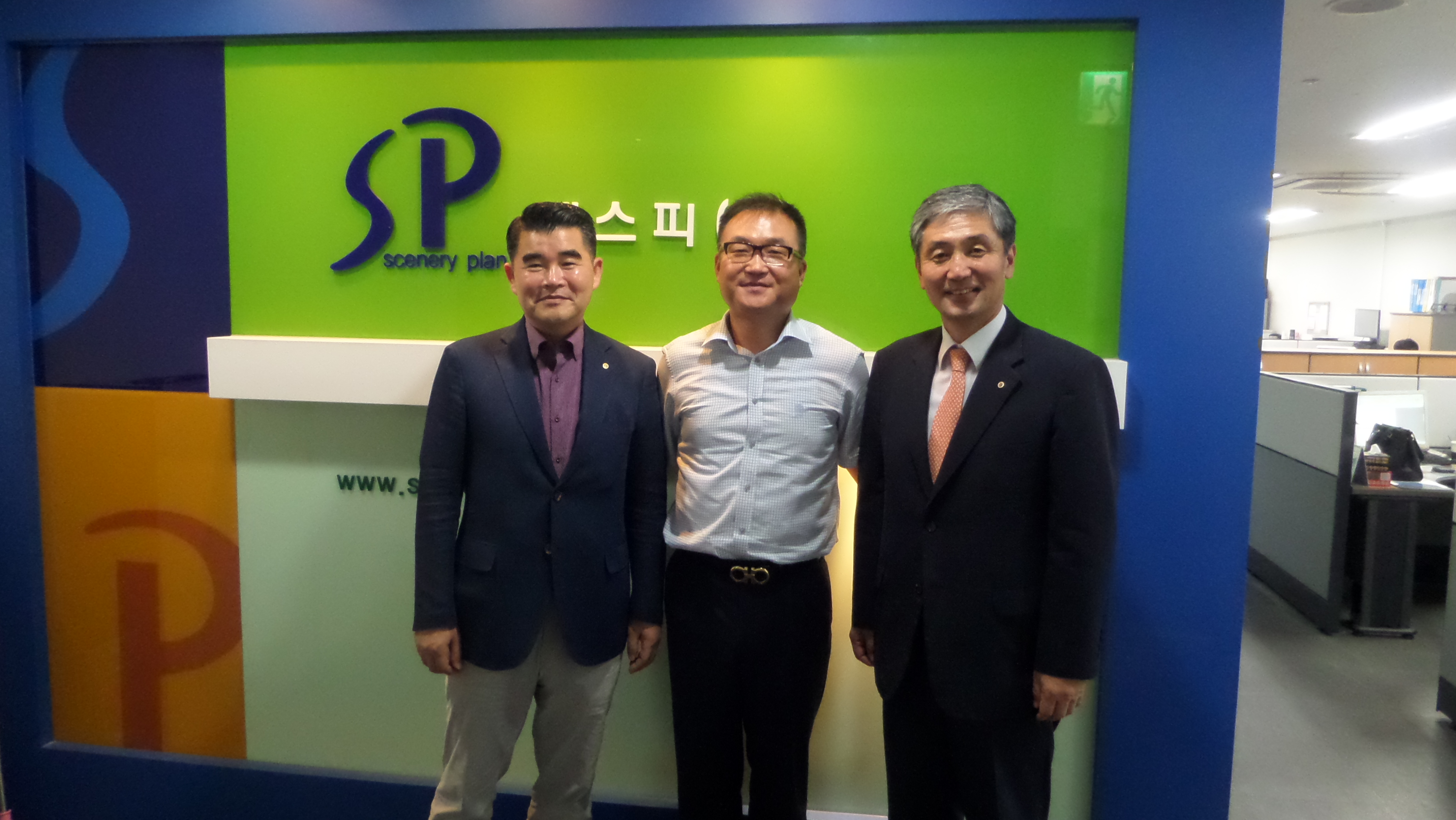 중앙에 김상* 동문 방문대상자 성 함 : 대표이사 김상* (공학대학원 CKO과정9기) 소 속 : 에스피(주) 방문자 성 명 : 김윤기(대학발전본부장), 이강준, 황원복(대학발전본부) 방문일시 : 2015년 7월 8일 14시 00분 방문장소 : 에스피(주) – 수원시 영통구 신동 486 디지털엠파이어Ⅱ 101동 1202호 에스피(주)는 가로등과 공원등, 보안등, 잔디등, 조명타워 등 옥외형 조명등을 비롯한 등기구와 부속자재를 디자인하여 제작하고, 직접 시공하는 야외 조명등 전문 종합회사이다. 2008년 7월 입주한 디지털엠파이어Ⅱ 사무실이 디자인실을 겸한 주 사업장이고, 생산은 8명 내외의 직원이 상주하는 오산공장에서 담당한다. 2006년에 9001(품질경영시스템)과 ISO 14001(환경경영시스템) 인증을 획득하였고, 2007년부터 미래 성장성과 기술 경쟁력을 갖춘 기업들에게 수여하는 인증 프로그램인 ‘기술혁신형중소기업’(INNO BIZ)에 선정되었으며, 같은 해에 ‘2007벤처기업’에 선정되었다. 2010년에는 개업 10년을 맞아 새로운 경영 비젼과 이미지 개선을 위하여 상호를 삼성에스피(주)에서 에스피(주)로 변경하였다. 사장실의 한 벽면 가득한 특허증과 디자인 등록증 등 각종 인증서가 그간 기술향상과 경영혁신을 위해 노력해온 회사의 면모를 여실이 보여주고 있다. 회사는 주로 수원과 경기도 인근의 건설시공 현장을 주 사업대상으로 하며, 무리하여 사업을 확장하지 않고 가족같은 분위기에서 내실 있게 운영하는 것을 목표로 꾸준히 노력하고 있다. 김상* 동문은 2008년 산업대학원( 현 공학대학원 ) CKO과정에 참여하여 여러 동문에게 젊은 사업가로서 역량을 인정받았고, 특별히, 동기 중에서 배필을 맞아 모든 동기의 축하 속에서 화촉을 밝히기도 하였다. 아울러, 일찍이 어려운 아이들을 위한 사회사업에도 관심이 많아 지속적으로 도움을 주고 있는 등 건실한 기업인으로 역할을 다하고 있다.