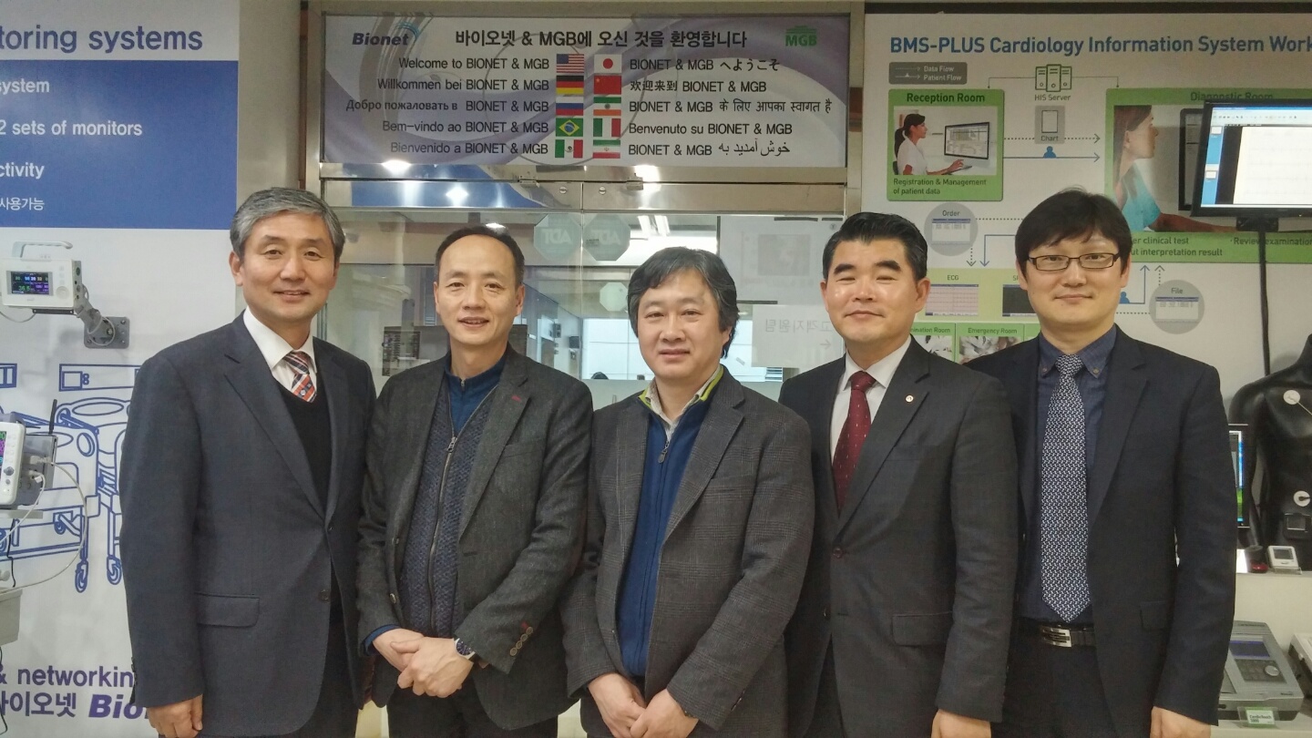 좌측 첫번째 김윤* 대학발전본부장, 두번째 강동* 대표이사, 중앙 한민* (주)엠지비엔도스코피 대표이사(84전자) 방문대상자 성함 : 강동* 대표이사(전자81) 소 속 : ㈜바이오넷,(주)엠지비엔도스코피 방문자 성명 : 김윤*(대학발전본부장), 이강*, 황원*(대학발전본부) 방문일시 : 2015년 3월 17일 11시 00분 방문장소 : ㈜바이오넷 본사(서울시 구로구 구로동 197-33, 이엔씨벤쳐 드림타워 3차 11층 1101호) 방문결과 : 강동* 동문은 김영* 전자공학과 교수님의 제자로 의용공학 분야의 석,박사과정을 마쳤다. 초음파 의료기기 벤쳐회사인 메디슨에서 근무하다 자회사인 '바이오시스' 설립에 참여하였고, 3년 만에 코스닥 상장에 기여하였으나 독자적인 길을 걷기위해 퇴사 후 바이오넷을 설립하였다. ㈜바이오넷은 1999년에 벤쳐형 중소기업으로 휴대용 다기능 생체신호 계측기기 시스템 및 제품 개발을 목적으로 설립되었다. 설립 초기에는 재택의료장비 등을 시작으로 하였으며 심전계, 태아심음심박 측정기, 산모감시장치, 분만감시장치, 체지방측정기, 환자감시장치 등을 연구, 개발하여 제조, 판매하였다. 현재에는 기존 제품의 꾸준한 연구개발과 함께 초음파 스케너, 의약품 주입펌프, 복강경 장비 등 의료기기를 전 세계로 확대 생산, 공급하고 있다. 심전계는 연간 1200대로 세계 최고수준의 판매 대수를 보이고 있으며, 자체 생산하는 초음파칩을 이용한 신개념의 스마트 휴대용 초음파 진단기는 2009년에 독일 의 제품 디자인 최고상인 레드 닷 디자인(Red DOT design) 상을 수상하였다. 2005년에는 독일 120년 역사의 내시경 및 수술기구를 개발 생산하는 ‘MGB Berlin’ 법인을 인수하여 유럽시장 진출에 교두보를 삼았고, 이후 미주시장을 위해 ‘Bionet America’, 중남미 의료기기 시장 확대를 위한 ‘Bionet Latin America’ 판매법인을 설립하였다. 연간 2,000대의 의료장비 생산 능력을 갖춘 안양공장을 별도로 운영하고 있으며, 전체 95명의 본사직원 중 연구인력이 45명에 달하며, 전체 사무공간 중 연구실이 절반을 넘게 차지하고 있어 연구개발 분야를 중요시 하는 강동* 사장의 의지를 엿볼 수 있었다. 현재 100여개국에 의료장비를 수출 중이며 2014년에는 1천3백만불의 매출을 기록하였고 이중 90%가 해외 판매실적이며, 이를 위해 1년의 절반을 해외법인관리와 영업을 위한 해외출장으로 보낸다고 한다. 현재도 김영* 교수의 제자들이 관련분야에 포진하여 우리나라가 초음파 진단 분야의 선두그룹으로 세계시장을 석권하는 데 많은 기여를 하고있는 것으로 소개하고 있다. ㈜바이오넷에도 모교 동문들이 간부급으로 상당수 재직 중이라고 한다. 동문 후배들이 회사의 미래를 함께하였으면 좋겠다는 생각을 가지고 있었으며, 기회가 된다면 모교에 연구소 설립등 협업에도 관심을 가지고 있었다. 2015.4.10. 총동문회 주최 모교 재학생 대상 잡페어에 참여를 권유하였고 호의적인 반응을 보였다. .