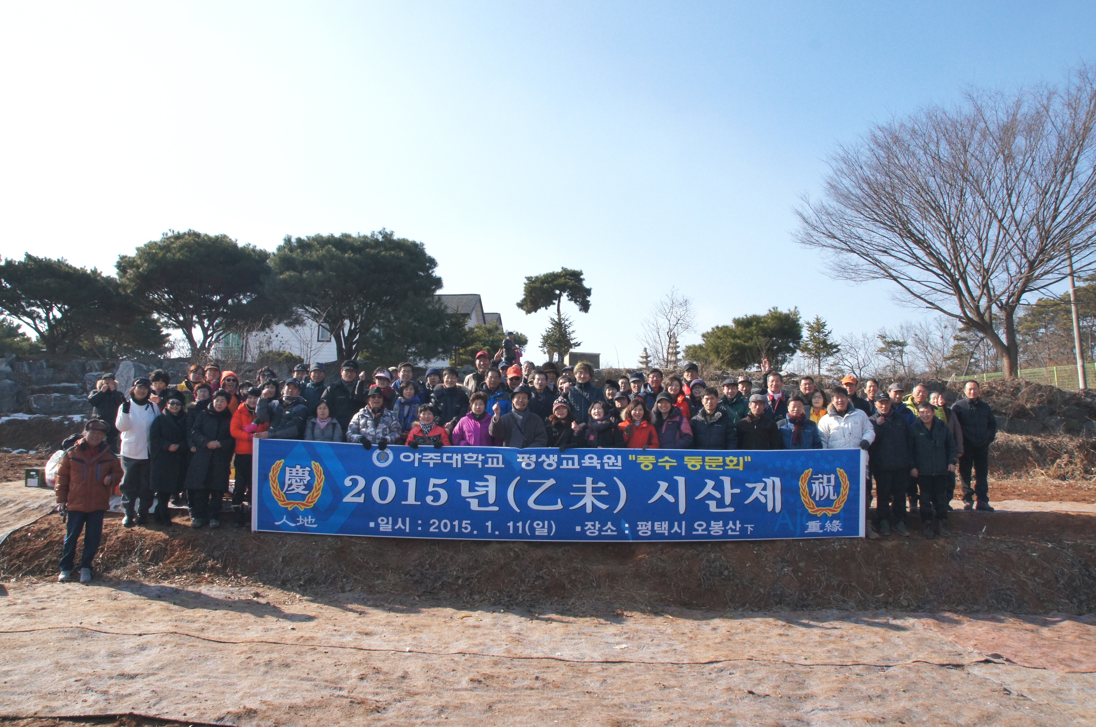 [평생교육원]풍수의 정석과정 2015년(乙未) 시산제 및 정기 동문답사 개최 일 시 : 2015년 1월 11일(일) 09:00 ~ 18:00 장 소 : 경기도 평택시 오봉산 등 참석자 : 이성엽 평생교육원장, 조남선 교수(풍수지리학자), 황용선 前 부시장(파주시), 최원택 前 부시장(화성시), 이승욱 원장(서울대학교 보건대학원), 한승구 사장(계룡건설), 재학생 및 동문회 포함 총 92명 참석 평생교육원 최고의 인기강좌 『풍수의 정석』과정이 지난 1월 11일 평택시 오봉산에서 2015년(乙未) 시산제 및 정기 동문답사를 개최하였다. 정규학기(봄·가을학기, 15주과정)와 계절학기(여름·겨울학기, 8주과정)로 운영하고 있는 『풍수의 정석』과정은 땅과 물, 바람의 조화를 관찰하여 좋은 땅과 그렇지 못한 땅을 구별하는 방법을 배울 수 있는 강좌로써 2003년부터 시작하여 현재 원내 최고 인기강좌로 운영되고 있다. 본 과정의 시산제는 2008년부터 시작되어 매년 새해 초 정기 현장답사와 함께 진행되며, 이번 시산제에서는 이성엽 평생교육원장, 황용선 前 부시장(파주시), 최원택 前 부시장(화성시), 이승욱 원장(서울대학교 보건대학원), 한승구 사장(계룡건설) 등 총 92명의 회원들이 참석하여 자리를 빛내주었다. 이번 행사는 학교에서 출발하여 평택시 오봉산에서 “자연에 대한 예를 갖추는” 시산제를 시작으로, 평택향교, 원균 장군 묘, 진위(振威)향교, 경주이씨 상서공파(이항복) 묘역 답사 순으로 진행되었다. 또한 이번 5월에는 동문발족기념행사와 스승의날 행사가 대규모로 개최될 예정이다. 한편, 『풍수의 정석』과정은 2015년 3월 봄 학기에 개강하며 자세한 사항은 아주대학교 평생교육원(031-219-1564)으로 문의하거나 혹은 아주대학교 풍수 동문회 카페를(http://cafe.daum.net/poongsu77)를 참고하면 된다. ※ 풍수의 정석과정 시산제 및 정기 현장답사 기념촬영 ※ 시산제를 개최하는 조남선 교수의 모습