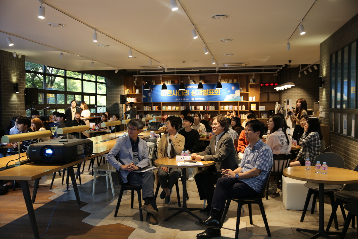 박형주 총장은 지난 9월 18일, 도서관 북카페에서 열린 2019 파란사다리 성과보고회에 참석하였다. 이 자리에서 학생들의 성과와 작은 도전에 대한 이야기를 듣고, 학생들과 대화하며 참가 학생들을 격려하였다.2019년도 2기 파란사다리 참가자 학생들의 성과발표회가 지난 18일 저녁 우리 학교 도서관 북카페에서 열렸다. 행사에는 올 여름 중국과 미국 명문대학 3곳으로 연수를 다녀온 파란사다리 참가자를 비롯해 박형주 총장과 파란사다리 1기 참가자, 교수 및 직원들이 참석했다. 참가자들은 연수 기간 쌓은 경험과 성휘한 개별 도전 및 팀 프로젝트 결과를 공유하고, 그 외 ▲박형주 총장과의 Q&A ▲시상 ▲경품 추첨 및 다과회 등의 프로그램이 진행됐다. 정창재 학생(경제학과 16, 미국 미시건대 파견)은 "막상 가서 새로운 환경에 부딪혀보고 해보지 못했던 도전을 해보니 스스로를 한 단계 더 발전시키는 경험이었다"고 말했다. 이효진 학생(국방디지털융합학과 18, 워싱턴대 파견)은 "워싱턴 대학에서 4주간의 생활을 통해 실제 미국 대학생이 된 것 같아 너무 좋았고 좀 더 공부를 열심히 하여 세계에서 영향을 끼칠 수 있는 사람이 되고 싶다"고 소감을 전했다. 이에 박형주 총장은 "인생은 살다 보면 시행착오도 생기고 계획한 대로 안되는 것도 생기고 좌절의 순간도 있지만 그래도 꿈은 크게 꿔야한다"고 참가학생들을 격려했다.파란사다리 프로그램은 취약 계층 대학생들을 위한 해외 연수 프로그램으로, 우리 학교가 지난 2015년 시작한 'AFTER YOU 프로그램'이 모태가 됐다. 파란사다리 사업은 사회·경제적으로 어려운 여건 속에서도 자기 계발과 진로 개척을 위해 노력하는 대학생에게 해외 연수를 지원하는 사업이다. 교육부와 한국장학재단은 올 한해 총 대학생 1,200명을 선발해 연수 경비를 지원하고, 선발된 학생들은 이번 여름 해외 대학에서의 4주간 어학연수 및 문화체험에 참여했다.올해 우리 학교는 파란사다리 사업의 주관대학으로 선정돼 100명의 학생(아주대 80명, 타대학 20명)을 선발하고 해외 연수를 진행했다. 학생들은 올여름 방학 4주 동안 미국 미시건대학교와 워싱턴대학교와 중국 상해교통대학교에 다녀왔다. 참가 학생 선발은 기존의 우리 학교 'AFTER YOU 프로그램”과 같이 학점·어학 등이 아닌 자기 계발과 미래에 대한 잠재력과 의지 등을 기준으로 이뤄졌다. 학생들의 교육 비용은 한국장학재단의 지원(70%)과 우리 학교 유쾌한 반란 기금(30%)으로 마련됐다. 유쾌한 반란 기금은 이 프로그램의 취지에 동참한 교내외 인사들의 기부금으로 조성된다. 한편, 2019년도 파란사다리 프로그램에는 우리 학교를 포함해 15개 대학이 파란사다리 사업에 참여했다. 수도권에서 우리 학교와 건국대, 삼육대, 한경대, 인천대가 참여하고 ▲충청·강원권 - 강원대, 충남대, 선문대 ▲호남·제주권 ? 전북대, 조선대 ▲대구·경북권 - 대구가톨릭대, 대구대, 계명문화대 ▲부산·울산·경남권 ? 동의대, 신라대가 포함됐다. 주관 대학은 대학별로 연수 프로그램을 운영하고 참여 학생들의 진로 멘토링을 비롯해 프로그램 전후 학생 관리를 맡는다. 학생들에게 격려의 말을 전하는 박형주 총장