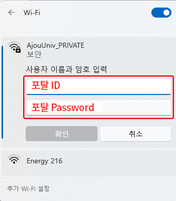 3. Wi-Fi SSID 목록 중 “AjouUniv_PRIVATE”,