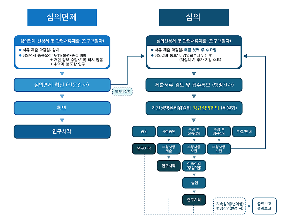- 시정승인 - 수정사항 제출 - 연구시작 - 지속심의(1년이상), 변경심의(변경 시) - 종료보고, 결과보고