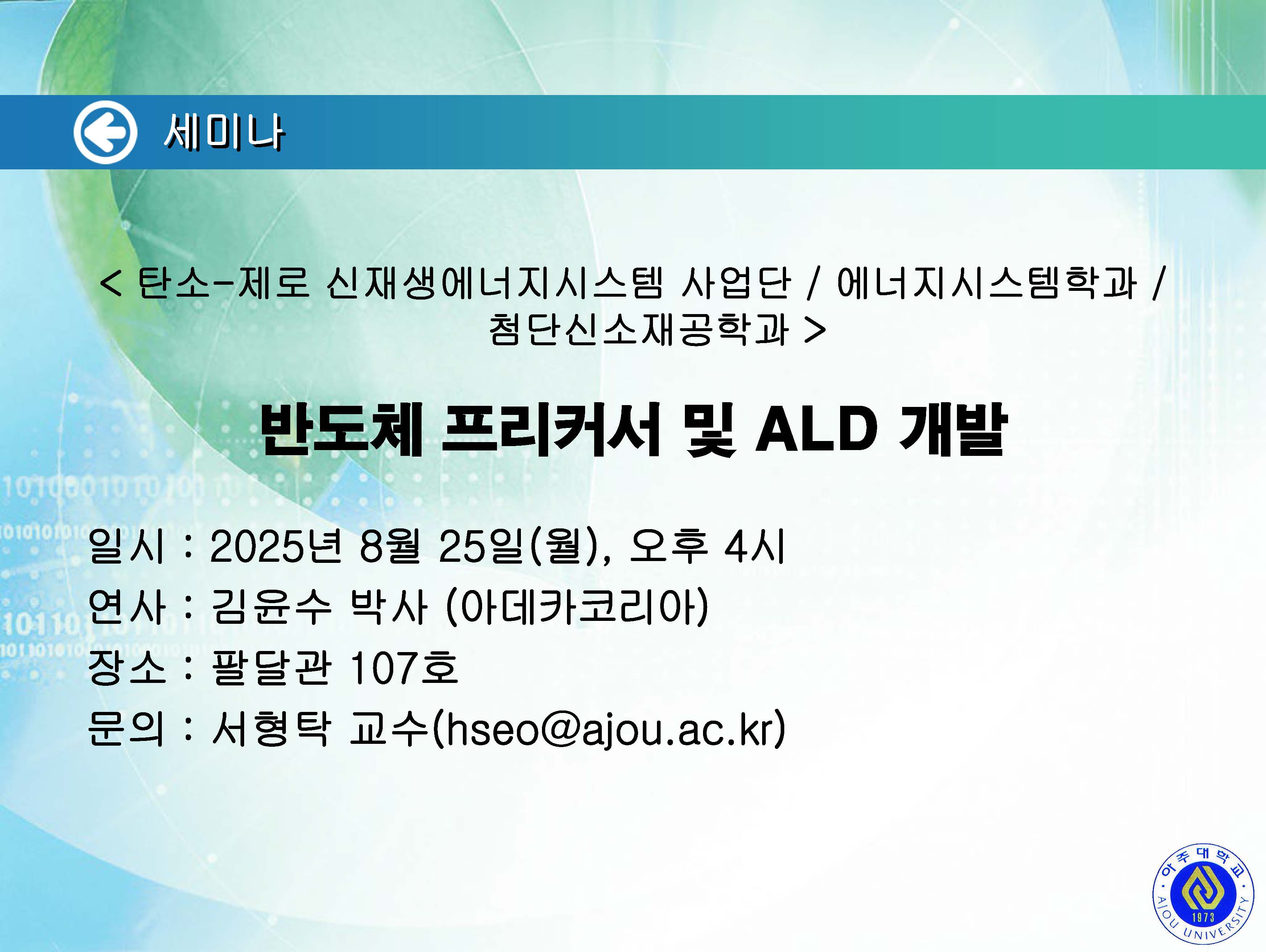 [2025.09.10.수] <신재생에너지세미나 / 탄소-제로 신재생에너지시스템 사업단 / 에너지시스템학과 / 첨단신소재공학과> 세미나 안내