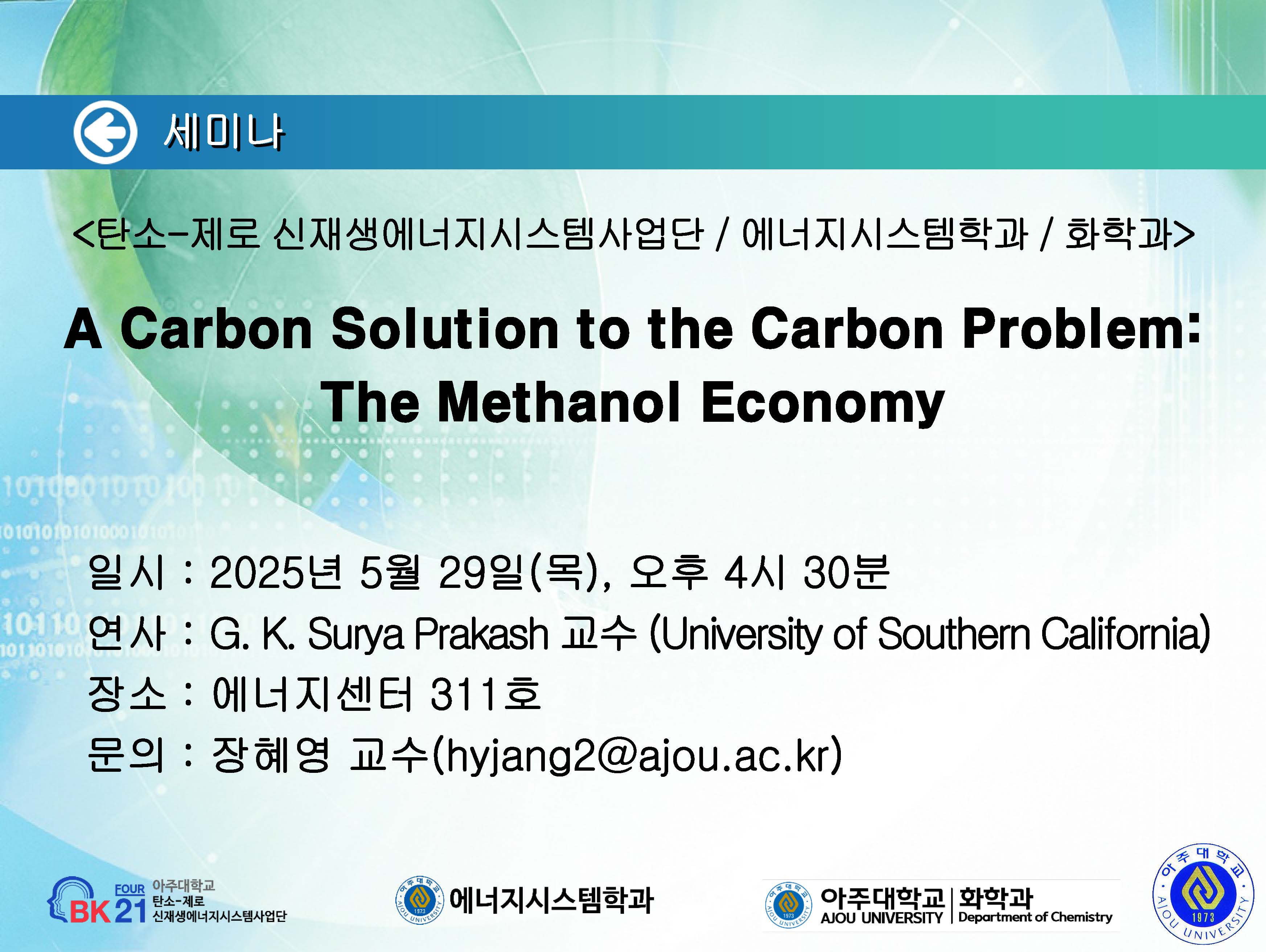 [2025.5.14.(수)] < 화학과 / G-램프(LAMP)사업단 / 탄소-제로 신재생에너지시스템사업단 / 기초과학연구소 > 세미나 안내