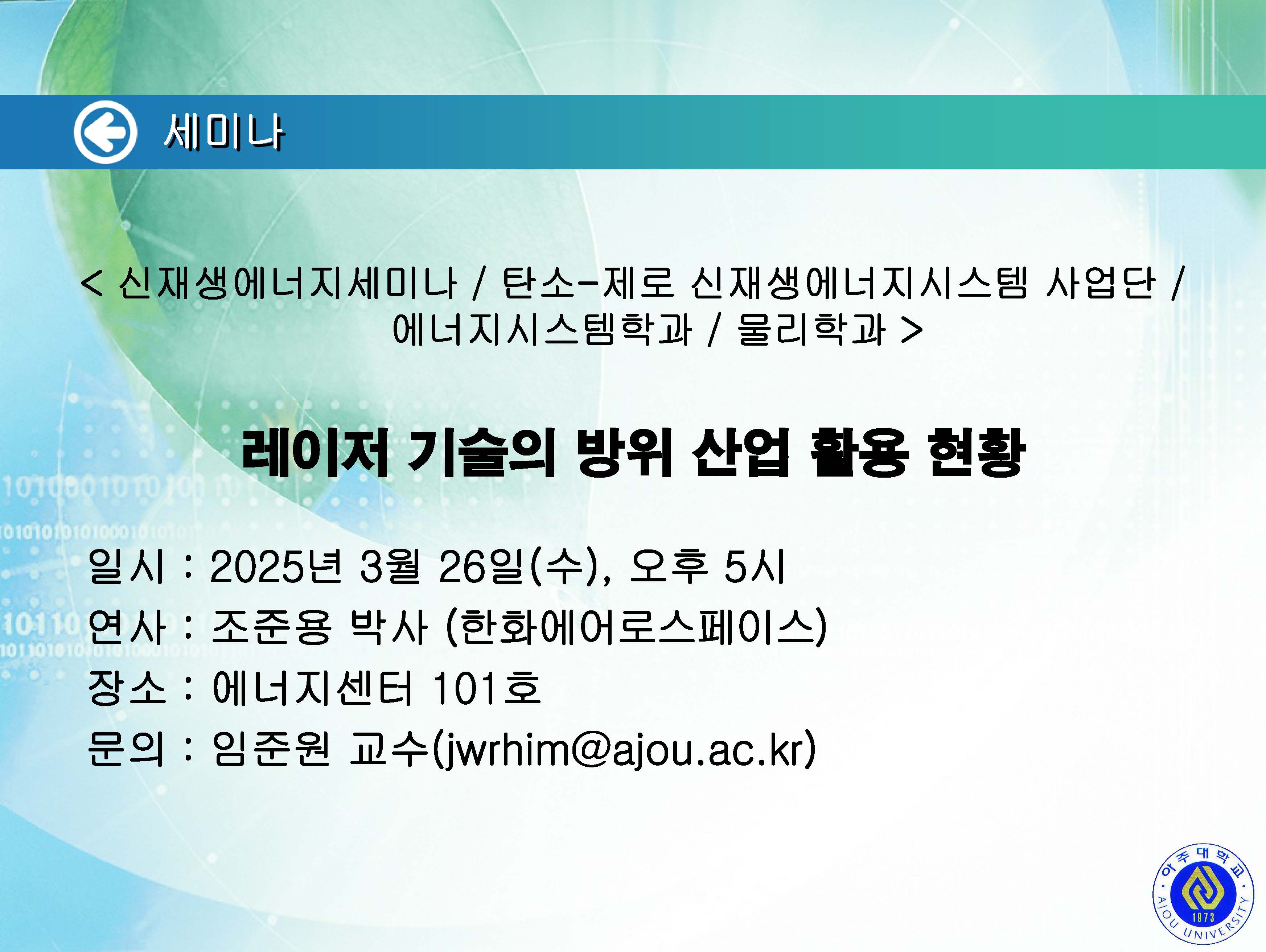[2025.03.26.수] <신재생에너지세미나 / 탄소-제로 신재생에너지시스템 사업단 / 에너지시스템학과 / 물리학과> 세미나 개최 안내