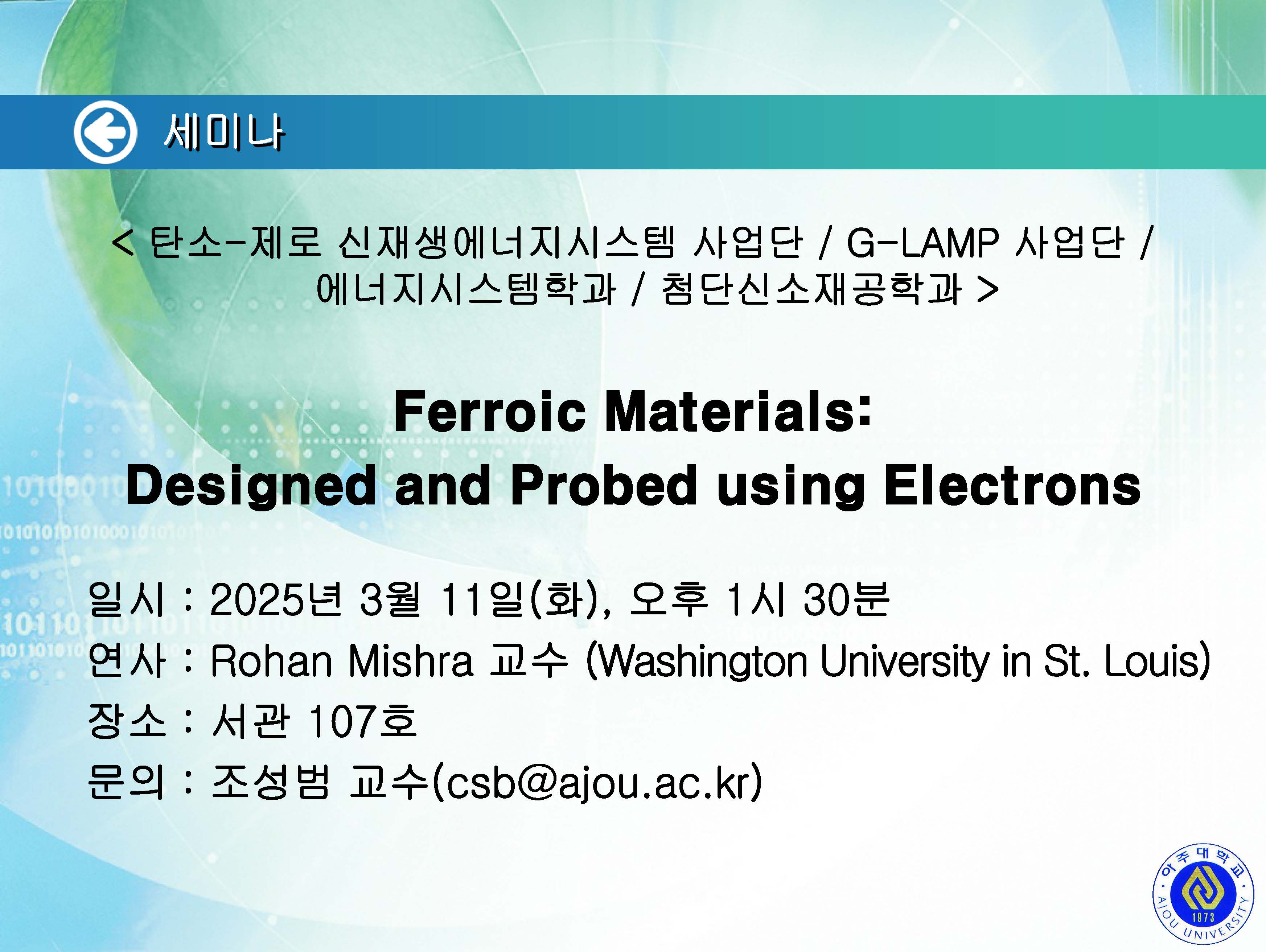 [2025.03.11.화] <탄소-제로 신재생에너지시스템 사업단 / G-LAMP / 에너지시스템학과 / 첨단신소재공학과> 세미나 개최 안내