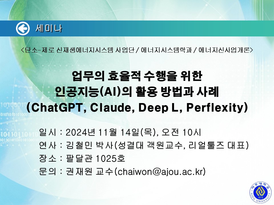 [2024.11.14.목] <탄소-제로 신재생에너지시스템 사업단/에너지시스템학과/에너지신사업개론> 업무의 효율적 수행을 위한 인공지능(AI)의 활용 방법과 사례