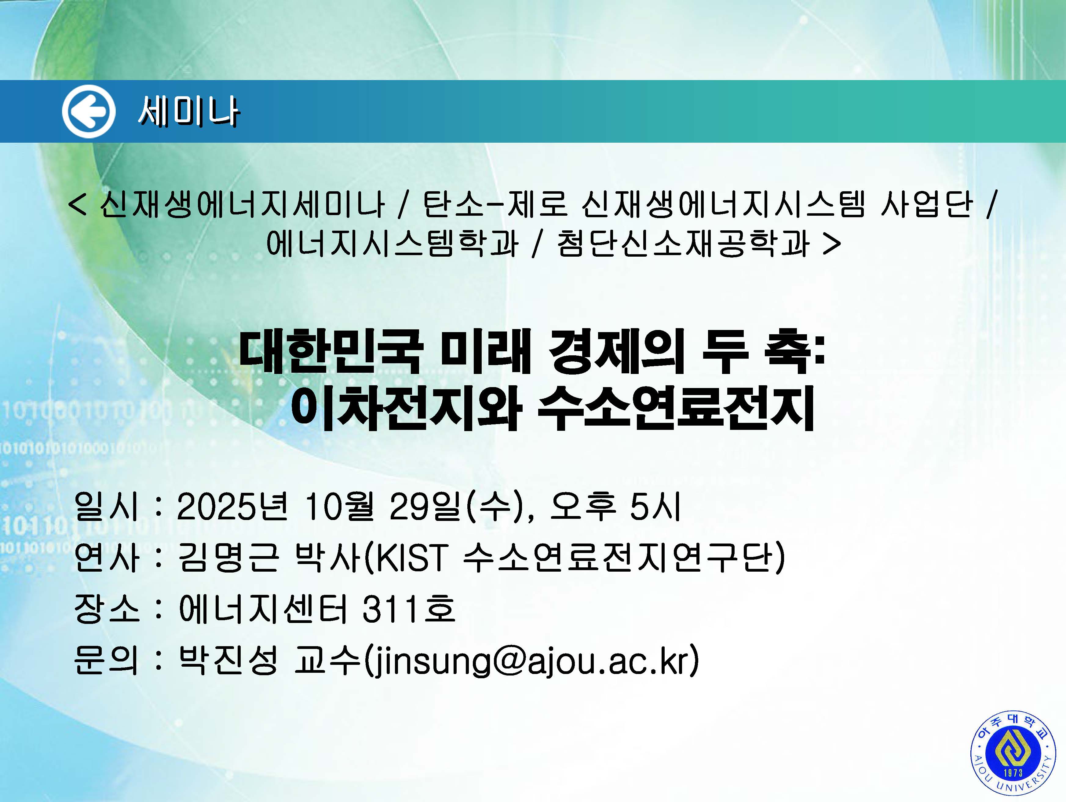 [2025.10.29.수] <신재생에너지세미나 / 탄소-제로 신재생에너지시스템 사업단 / 에너지시스템학과 / 첨단신소재공학과> 세미나 안내