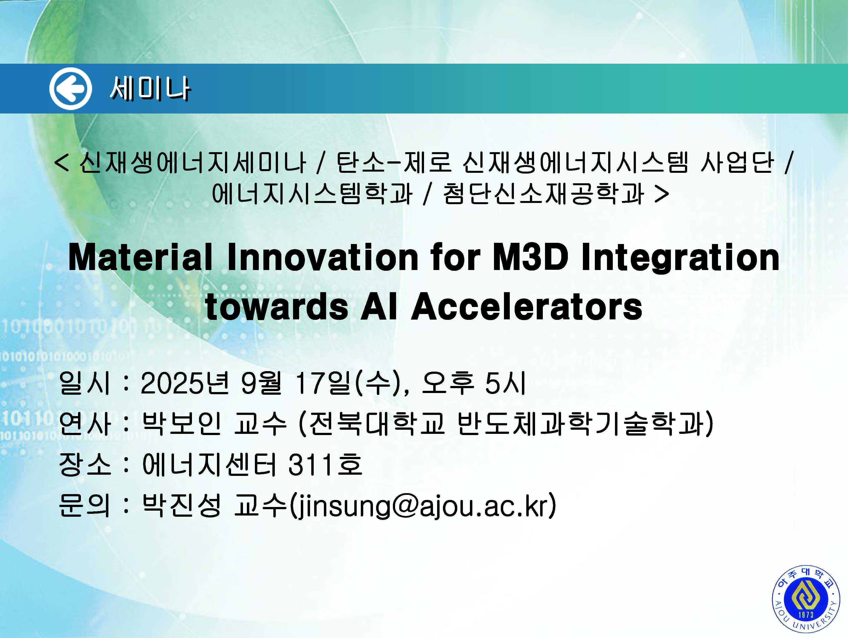 [2025.09.17.수] <신재생에너지세미나 / 탄소-제로 신재생에너지시스템 사업단 / 에너지시스템학과 / 첨단신소재공학과> 세미나 안내