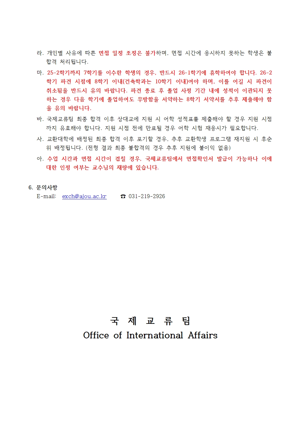 3) 면접확인서 발급이 필요한 학생의 경우, "면접전형 종료 이후" 일주일 이내로 exch@ajou.ac.kr로 성명/학과/학번/배정된 면접시간과 함께 요청 이메일을 보내주세요.